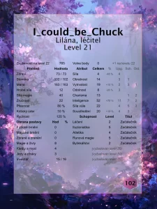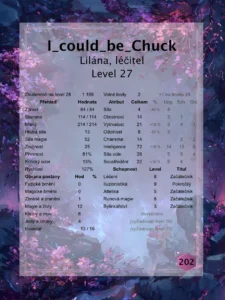 Leona si prohlíží Chuckovy statistiky po založení party.